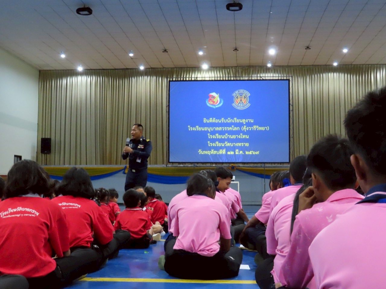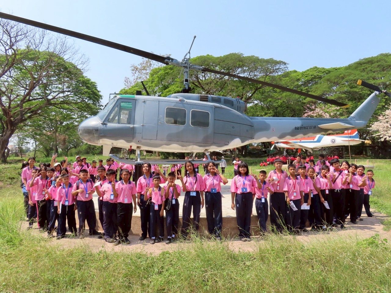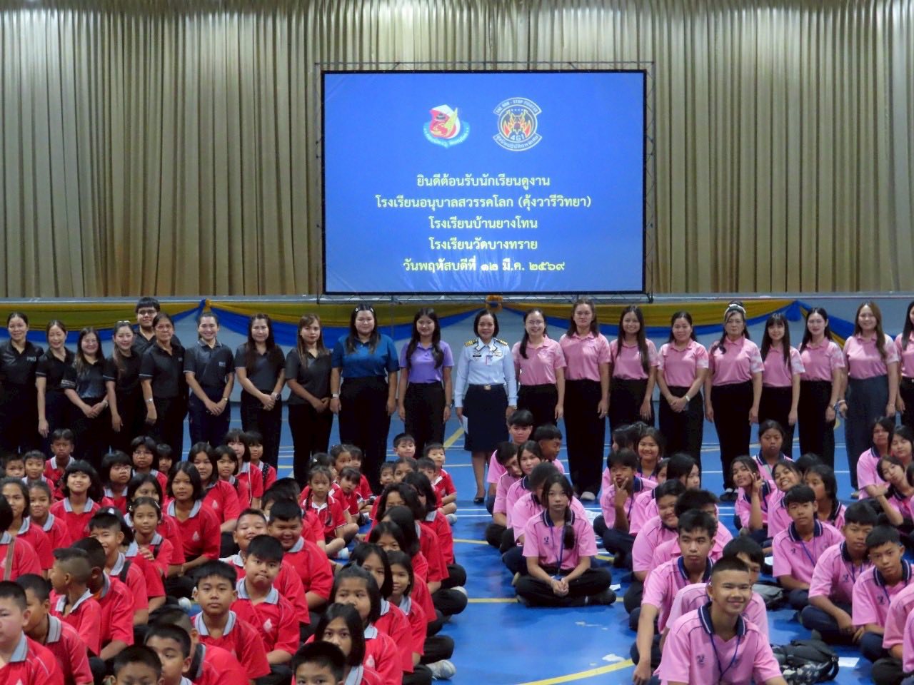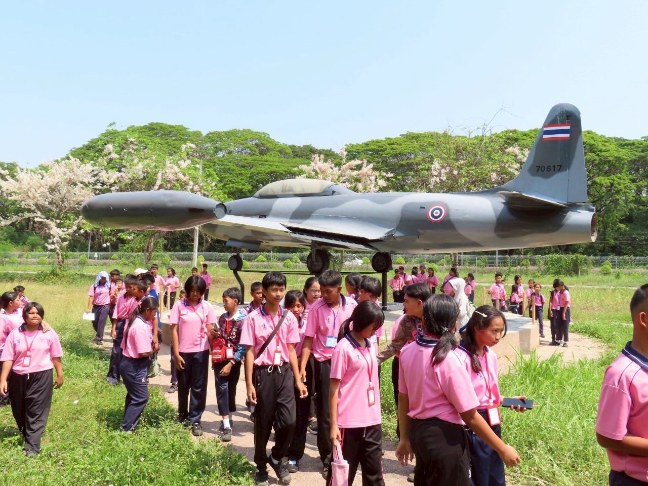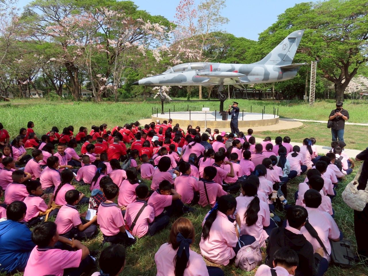 นาวาอากาศเอก พนม ดอนตุ้มไพร ผู้บังคับการกองบิน 46 มอบหมายให้ นาวาอากาศเอกหญิง ณัฐสินี เชื้อนุ่น หัวหน้าแผนกกิจการพลเรือน กองบังคับการ กองบิน 46 ต้อนรับคณะครู และนักเรียน