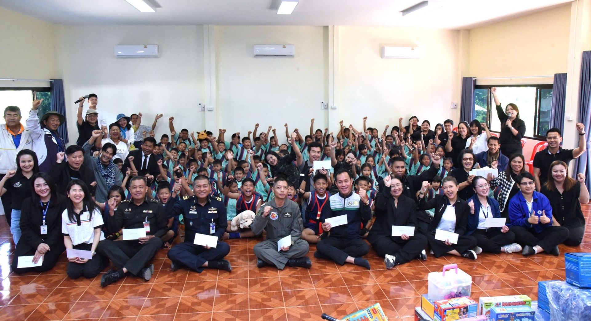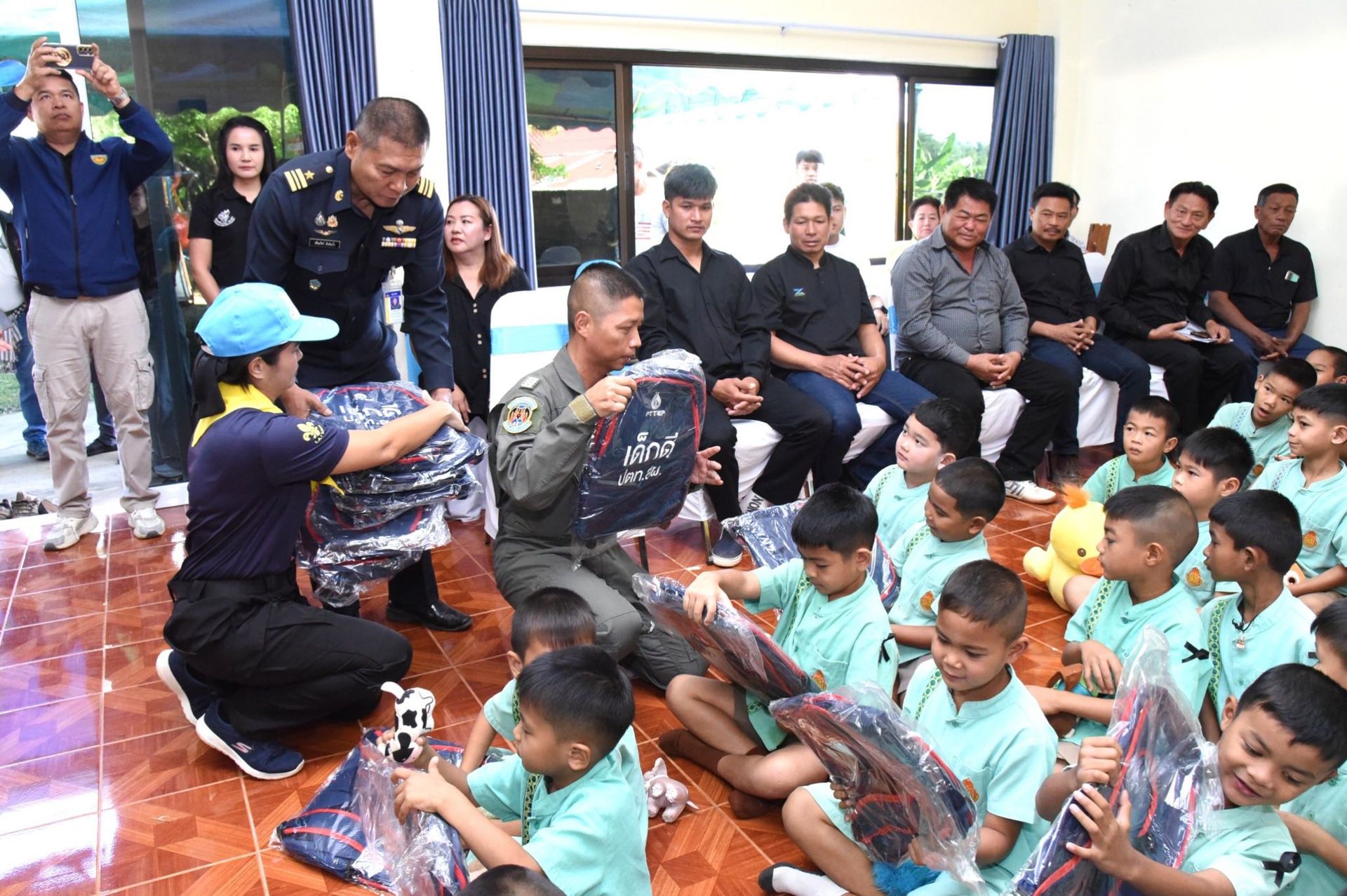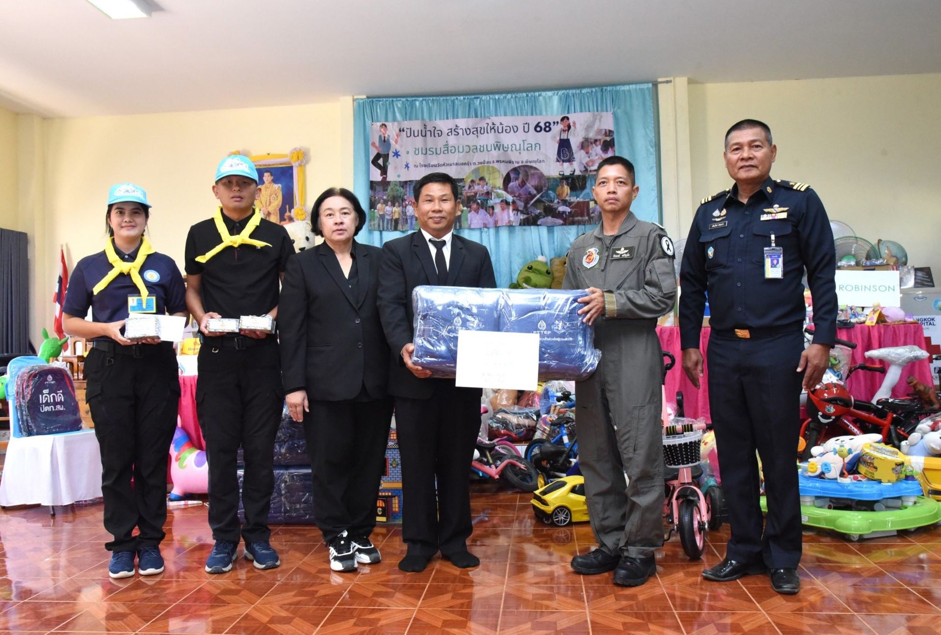 โดยภายในกิจกรรมประกอบด้วย เงินสนับสนุนการศึกษา, อุปกรณ์การกีฬา, อุปกรณ์การศึกษา, ของเล่นเสริมทักษะ, ผ้าห่มกันหนาว สนับสนุนโดย บริษัท ปตท.สำรวจและผลิตปิโตรเลียม จำกัด (มหาชน) ร่วมกับ กองบิน 46 และมอบ ชุดยาสามัญประจําบ้าน