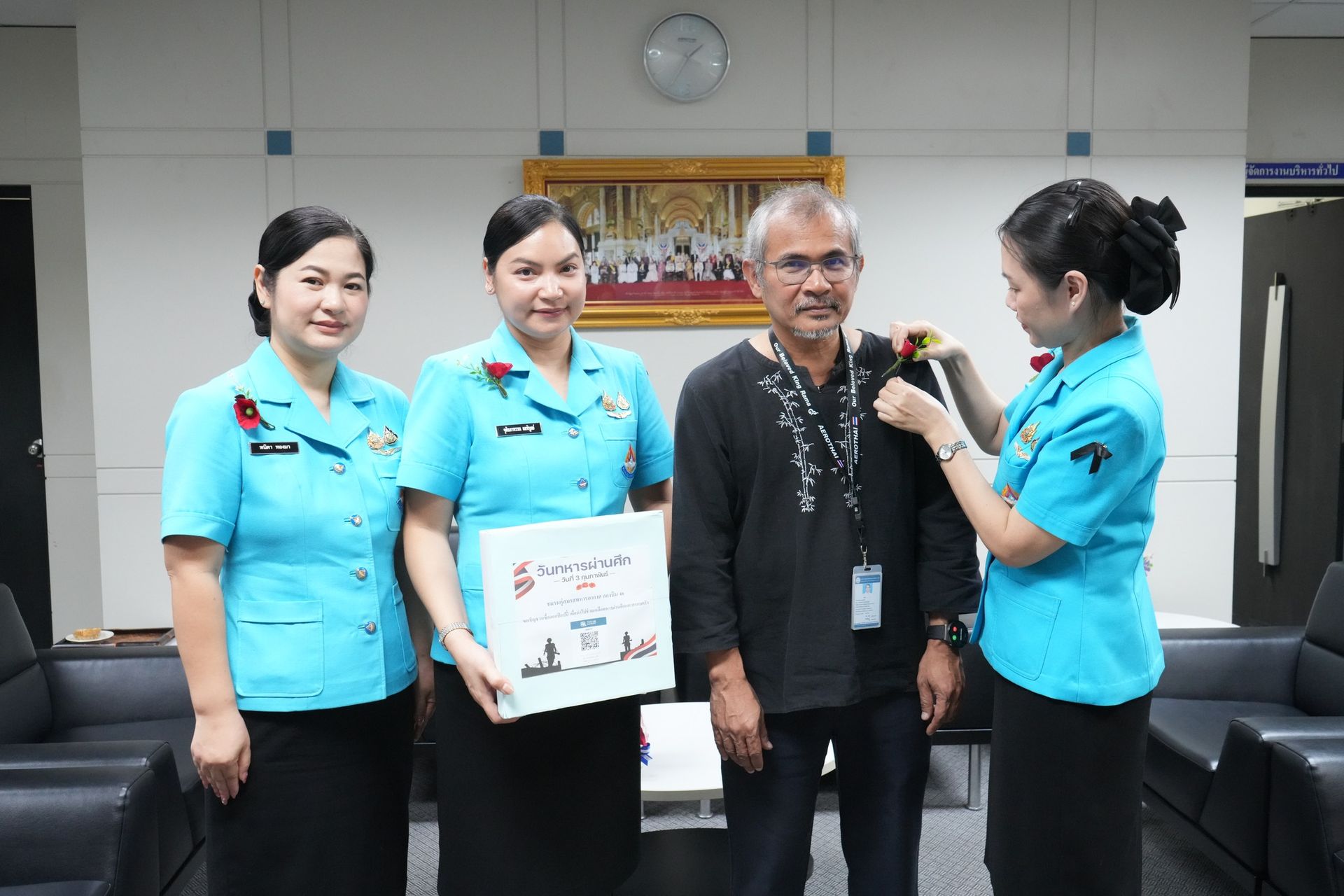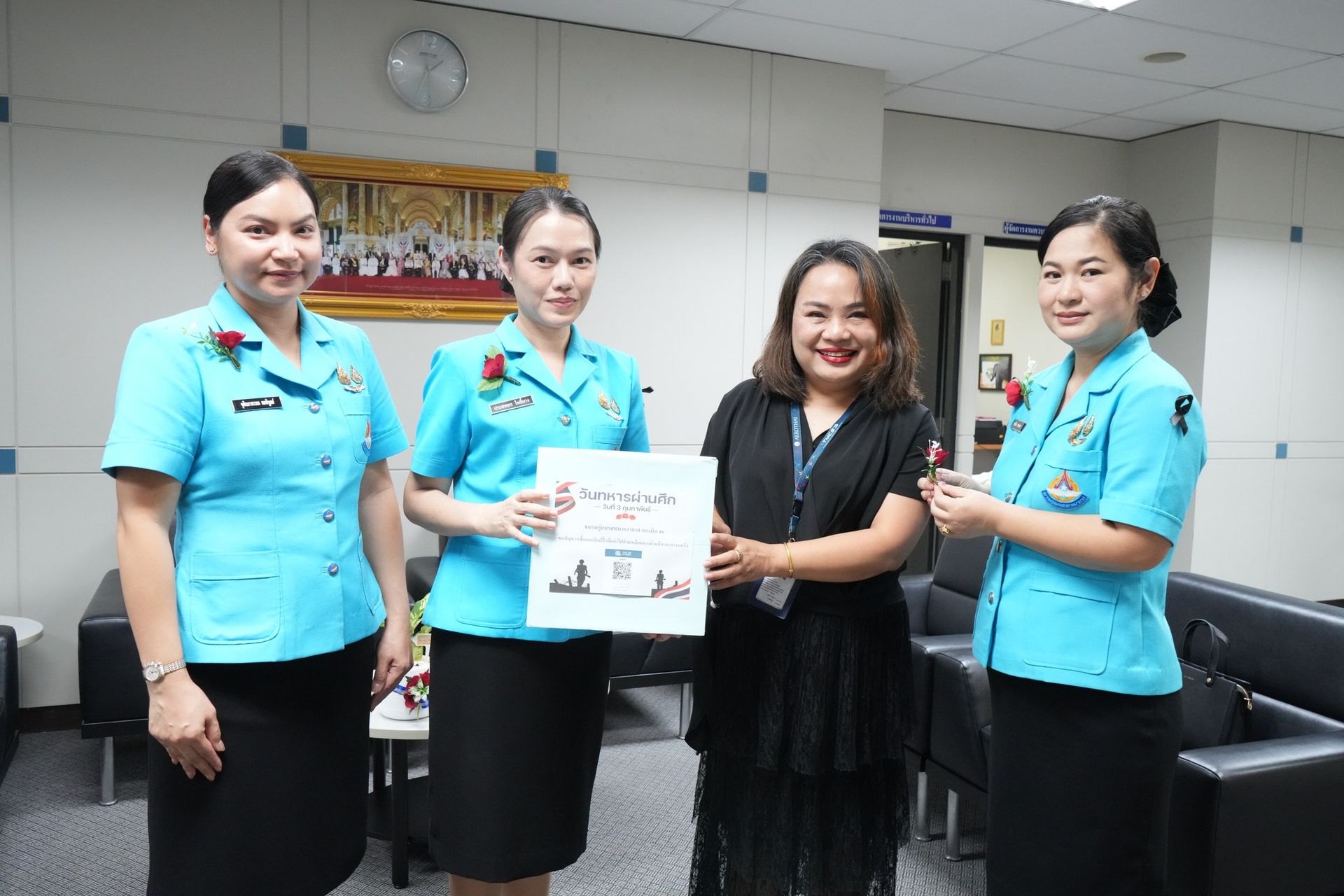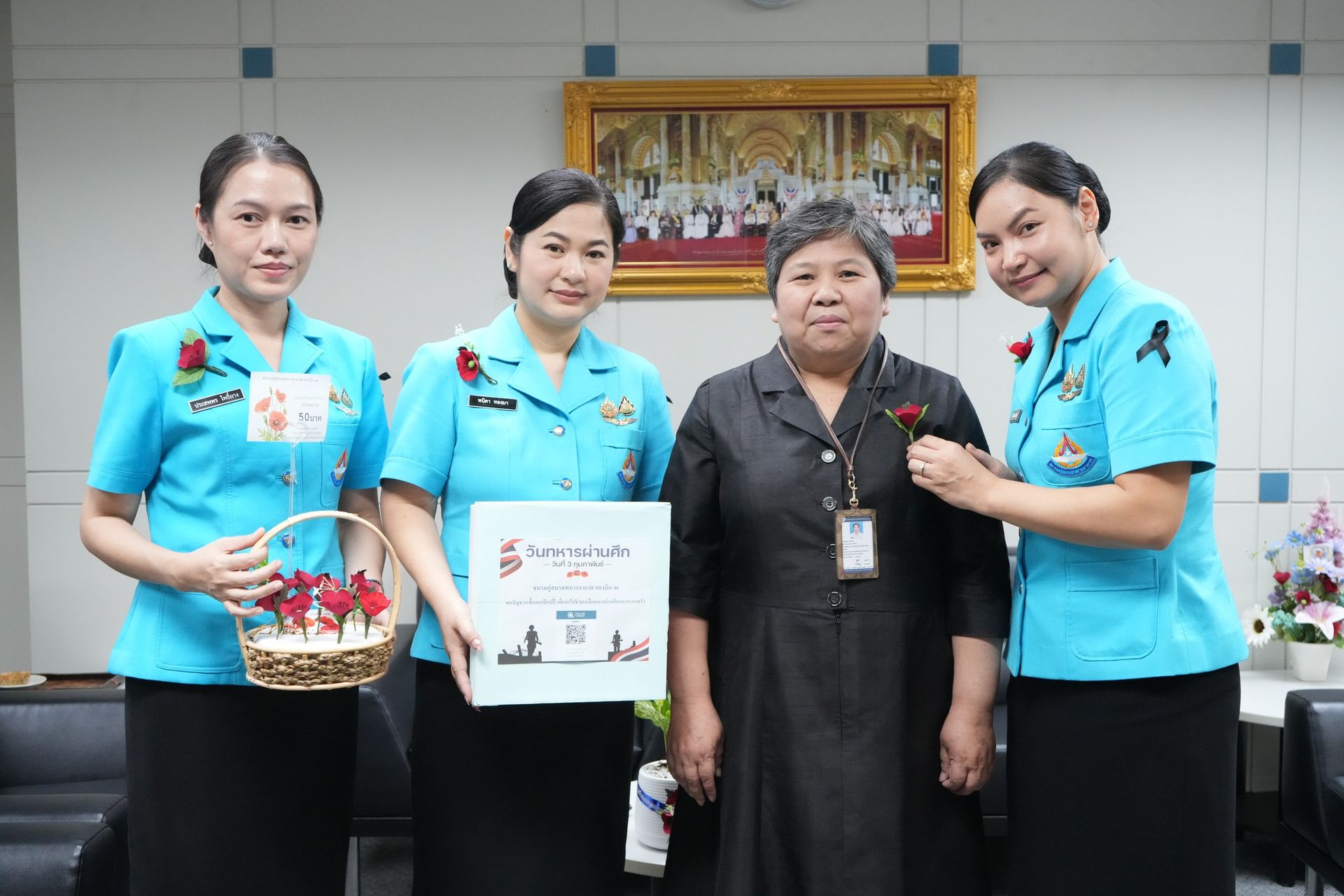 คุณจุตินภาพรรณ ผลพิบูลย์ รองประธานชมรมคู่สมรสทหารอากาศ กองบิน 46 (1) พร้อมด้วย รองประธานชมรมคู่สมรส กองบิน 46 (2, 3) และสมาชิกชมรมคู่สมรส กองบิน 46 นำดอกไม้ที่ระลึกวันทหารผ่านศึก “ดอกป๊อปปี้” ออกจำหน่าย ณ