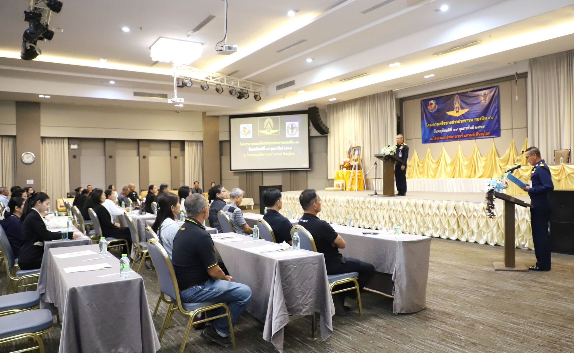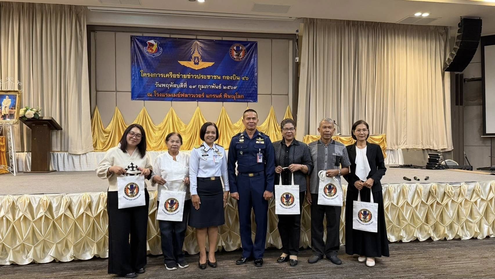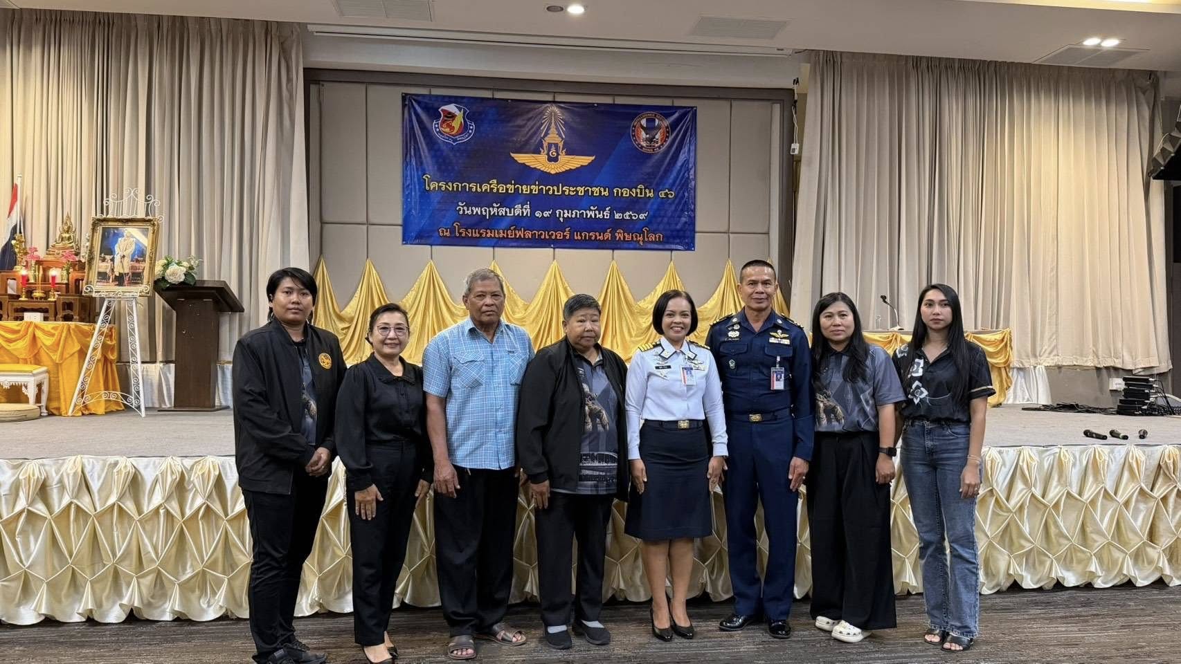 นาวาอากาศเอก พนม ดอนตุ้มไพร ผู้บังคับการกองบิน 46 เป็นประธานในพิธีเปิดโครงการเครือข่ายข่าวประชาชนกองบิน 46 ประจำปี 2569 เพื่อสร้างและพัฒนาเครือข่ายข่าวประชาชนในพื้นที่รอบที่ตั้งกองบิน 46 ให้มีความเข้มแข็ง สามารถประสานการแจ้งข้อมูลข่าวสารที่เป็นประโยชน์ต่อการรักษาความปลอดภัยของหน่วยได้อย่างมีประสิทธิภาพ อีกทั้งยังเป็นการส่งเสริมความสัมพันธ์อันดีระหว่างกองบิน 46 ผู้นำชุมชน และประชาชนในพื้นที่ อันจะนำไปสู่ความร่วมมือที่แน่นแฟ้นในการสนับสนุนภารกิจด้านการข่าวกรองและการรักษาความมั่นคงต่อไป ณ โรงแรมเมย์ฟลาวเวอร์ แกรนด์ พิษณุโลก อำเภอเมือง จังหวัดพิษณุโลก เมื่อวันที่ 19 กุมภาพันธ์ พ.ศ.2569
