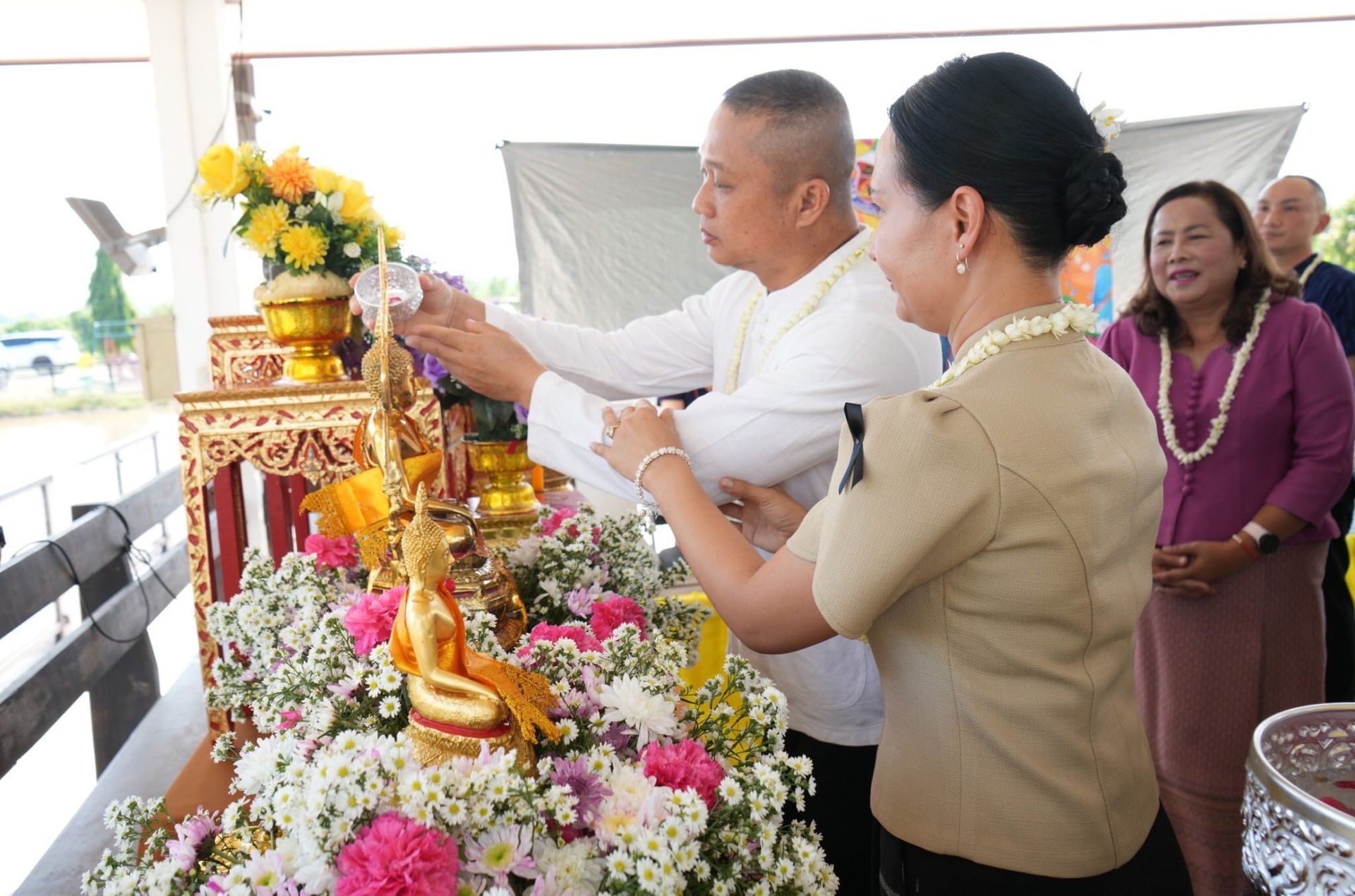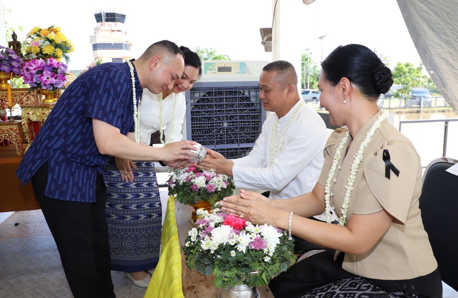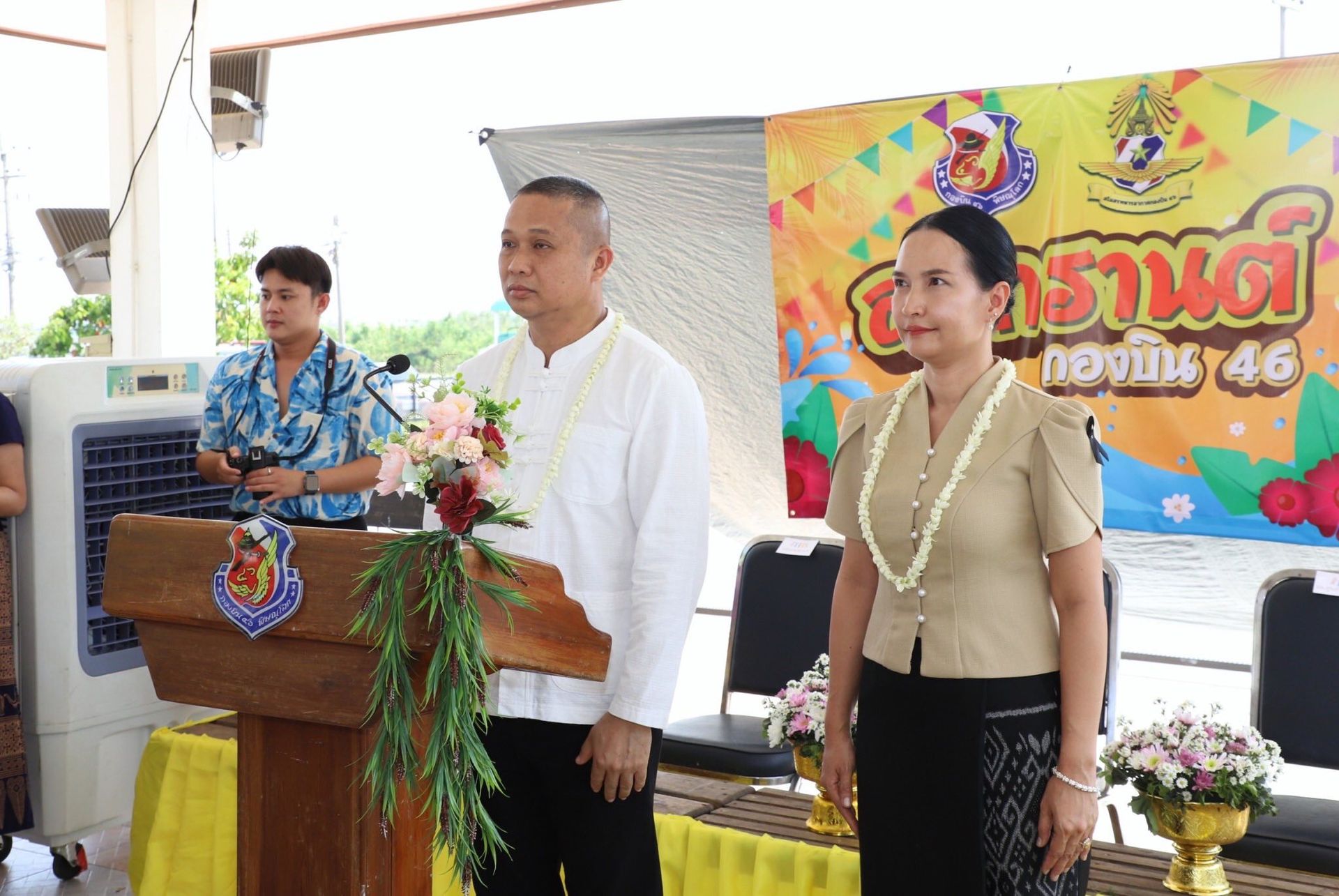 นาวาอากาศเอก พนม ดอนตุ้มไพร ผู้บังคับการกองบิน 46 พร้อมด้วย คุณศิริวรรณ ดอนตุ้มไพร ประธานชมรมคู่สมรสทหารอากาศ กองบิน 46 เป็นประธานในพิธีสรงน้ำพระพุทธรูป และรดน้ำขอพรผู้บังคับบัญชา เนื่องในเทศกาลวันสงกรานต์ ประจำปี 2569