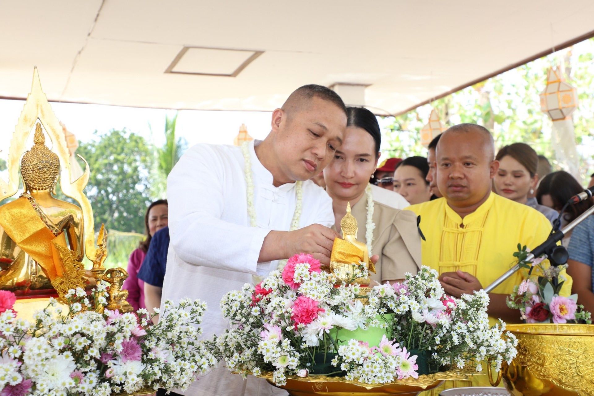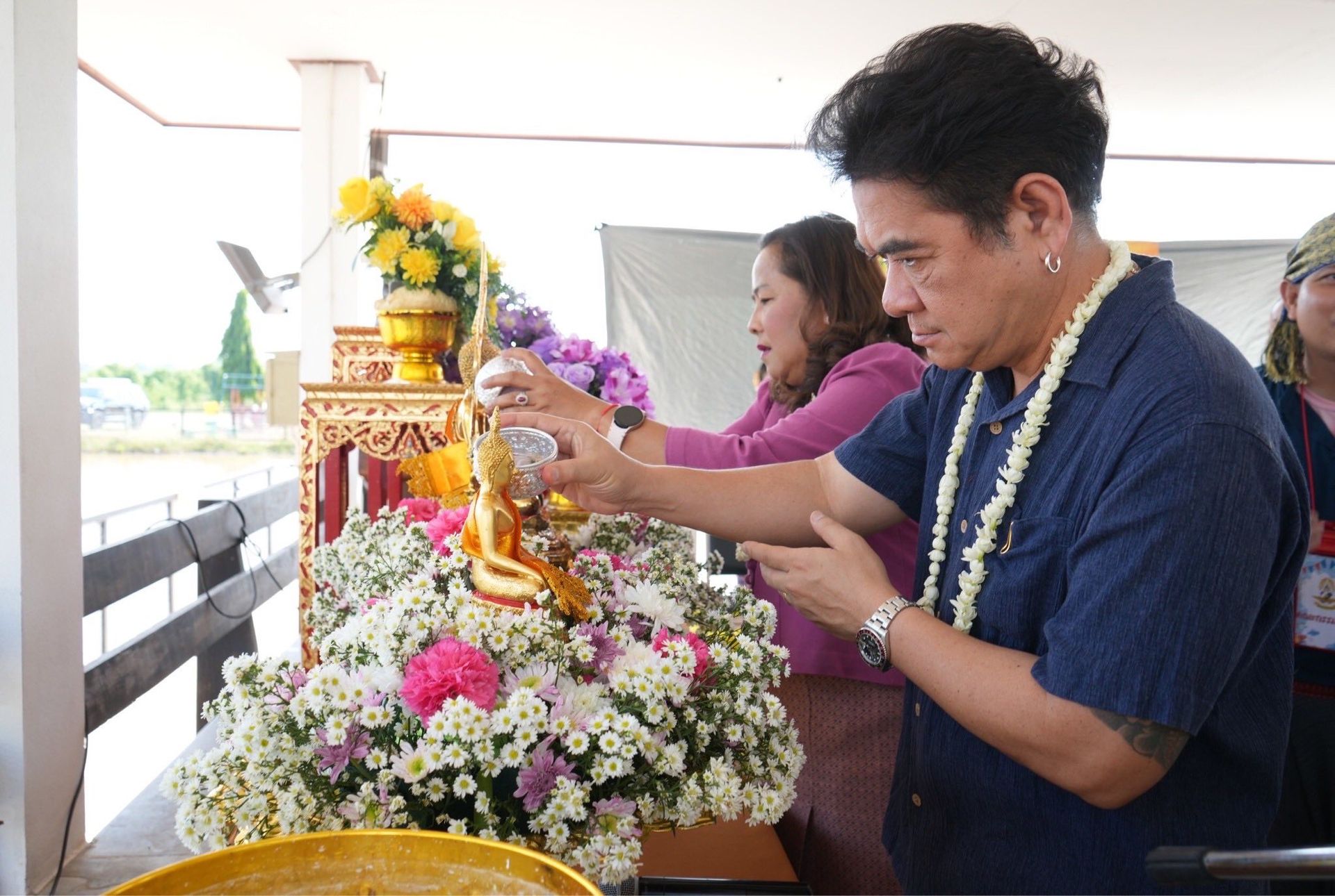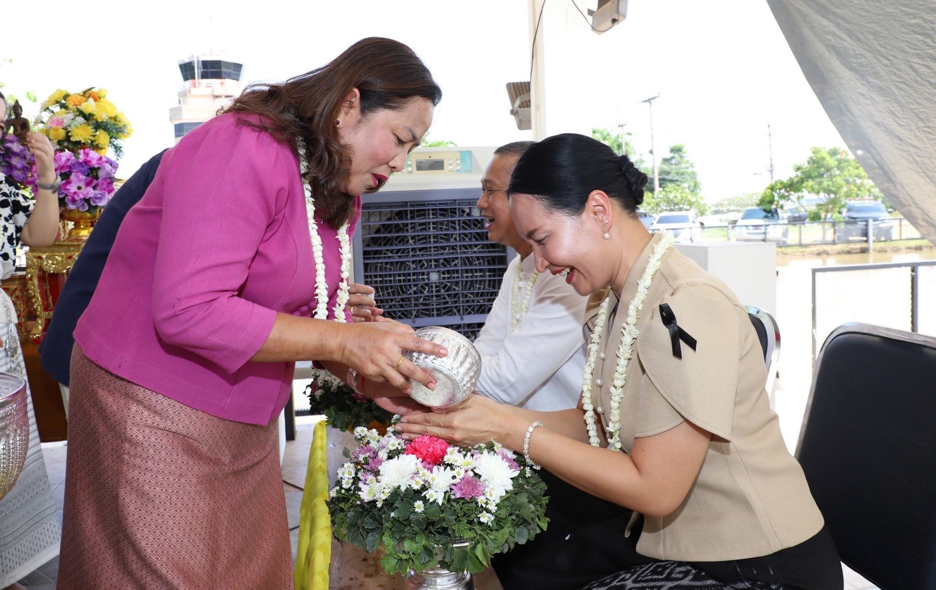 นาวาอากาศเอก พนม ดอนตุ้มไพร ผู้บังคับการกองบิน 46 พร้อมด้วย คุณศิริวรรณ ดอนตุ้มไพร ประธานชมรมคู่สมรสทหารอากาศ กองบิน 46 เป็นประธานในพิธีสรงน้ำพระพุทธรูป และรดน้ำขอพรผู้บังคับบัญชา เนื่องในเทศกาลวันสงกรานต์ ประจำปี 2569