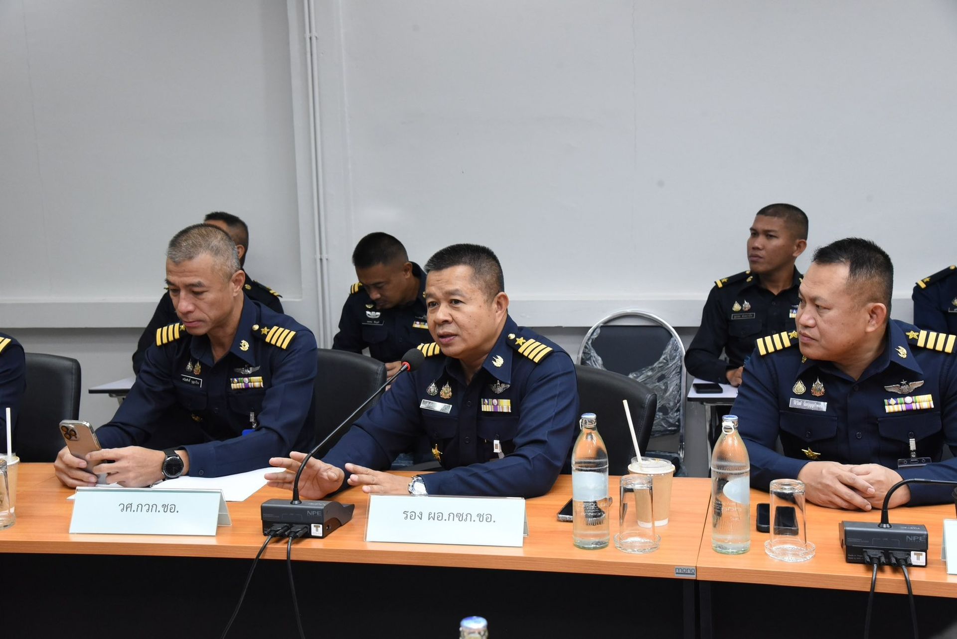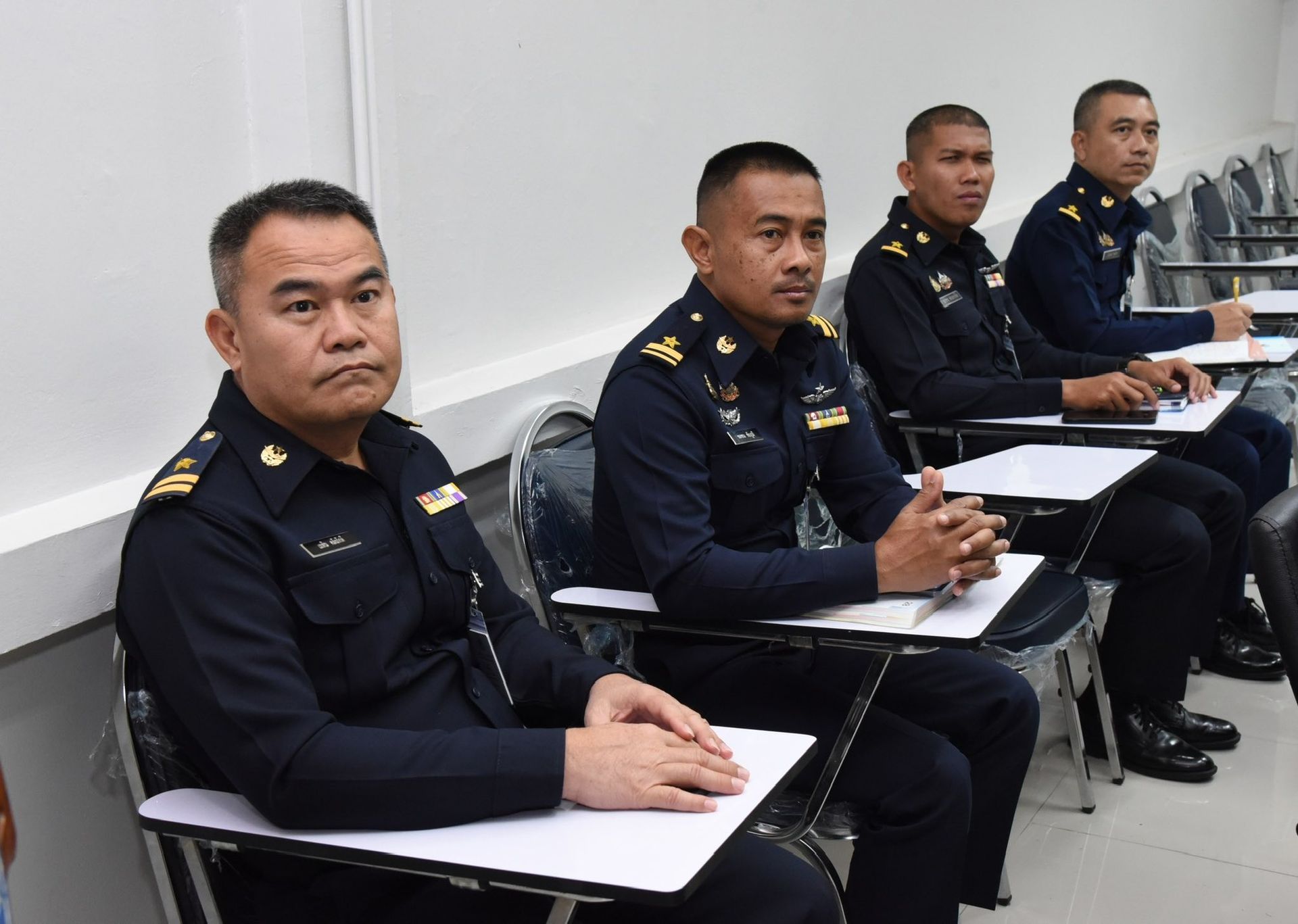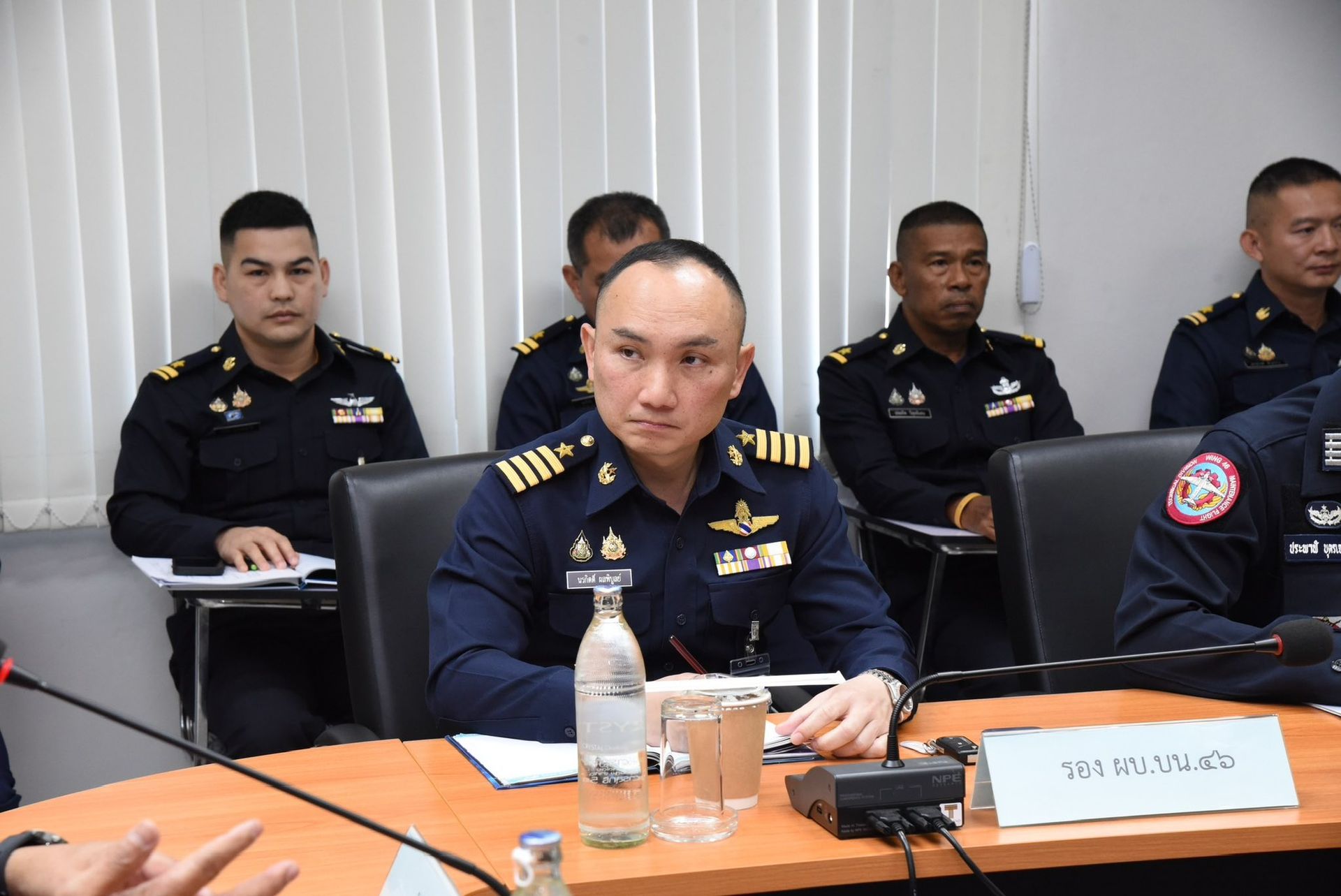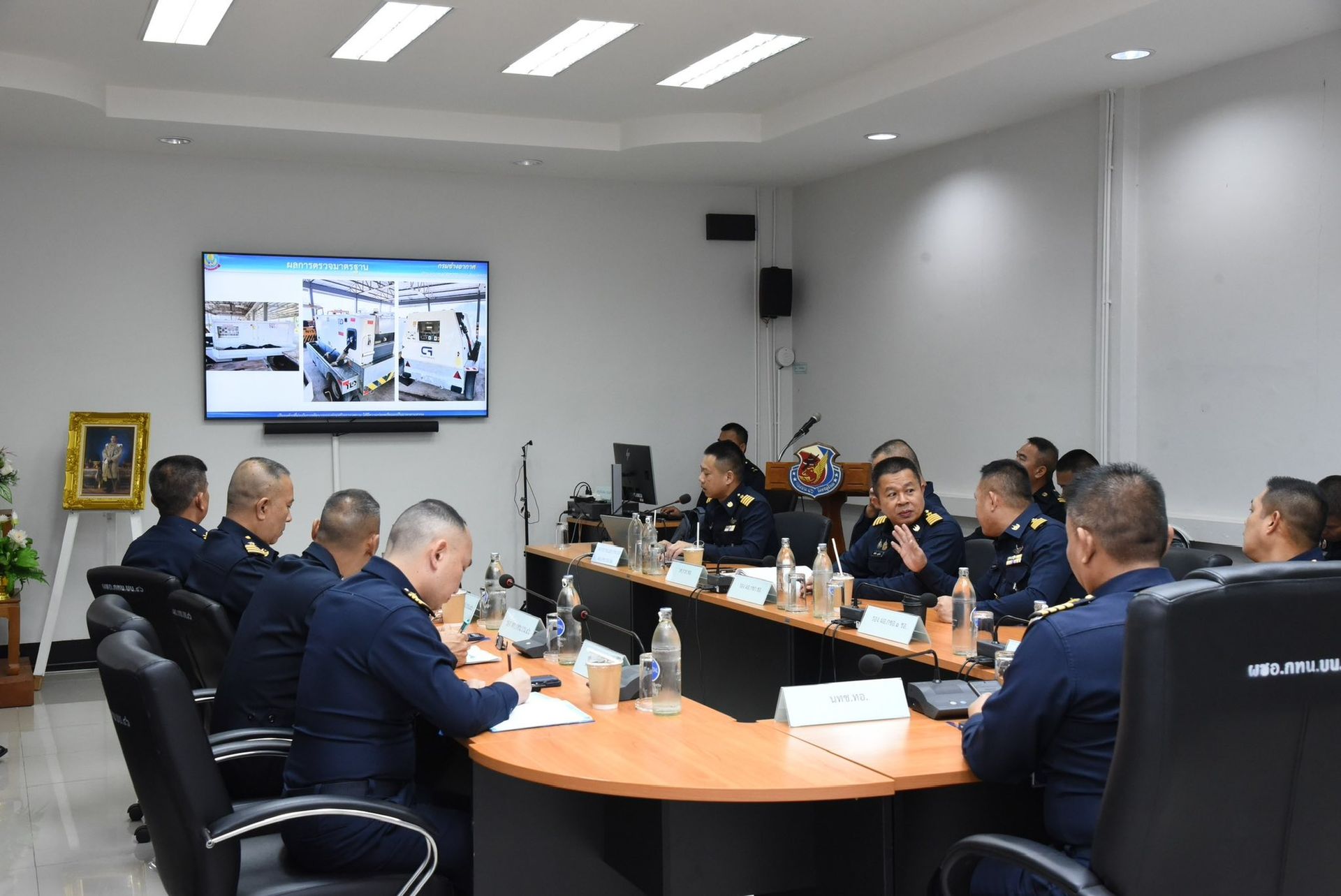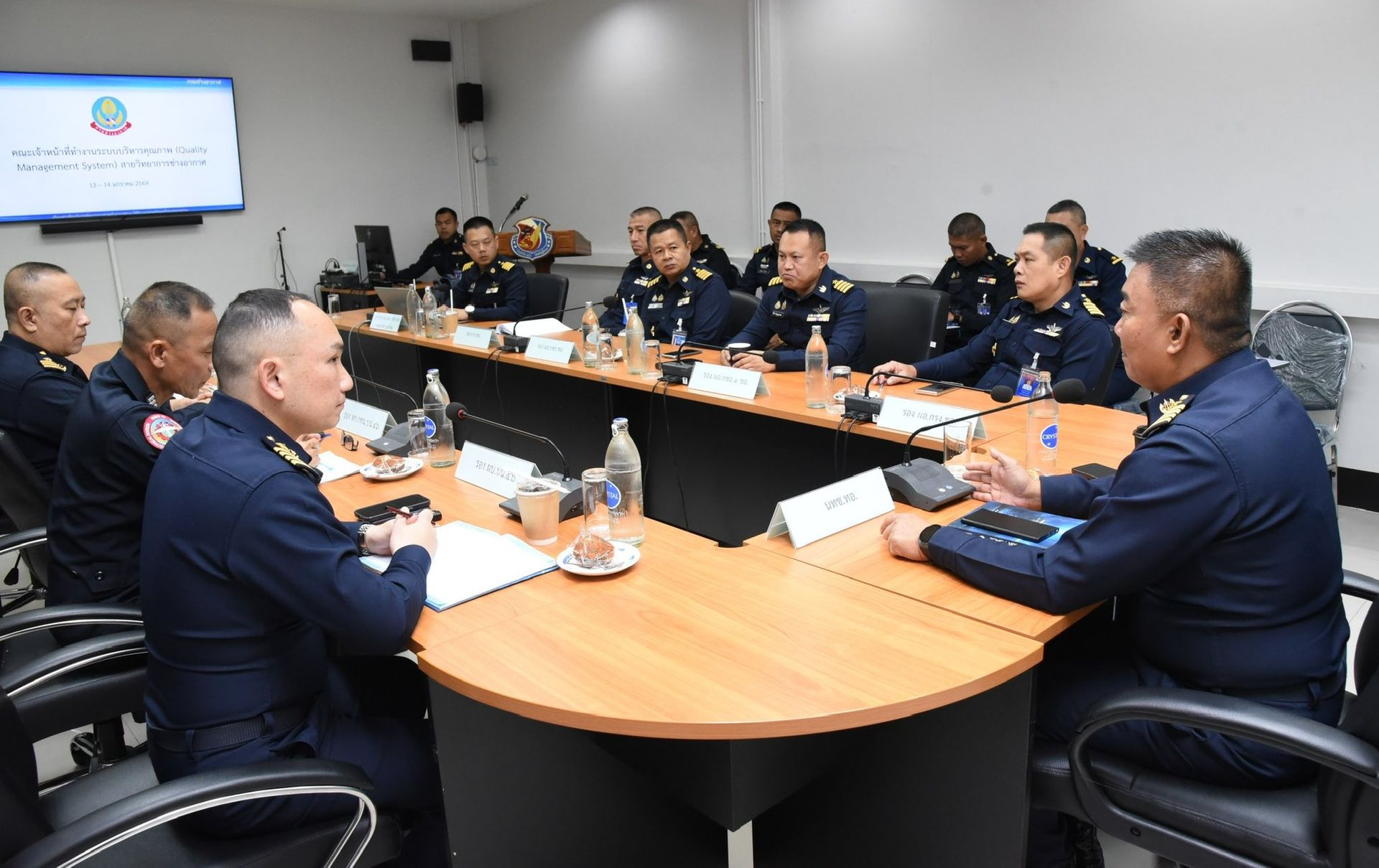 นาวาอากาศเอก นรกิตติ์ ผลพิบูลย์ รองผู้บังคับการ กองบิน 46 พร้อมด้วยหัวหน้าหน่วยขึ้นตรง กองบิน 46 รับฟังบรรยายสรุป ผลการตรวจมาตรฐานการซ่อมบำรุงอากาศยาน กองบิน 46 ประจำปี 2569 จากคณะเจ้าหน้าที่ตรวจมาตรฐาน สายวิทยาการช่างอากาศ ณ ห้องประชุมแผนกช่างอากาศ กองเทคนิค กองบิน 46 อำเภอเมือง จังหวัดพิษณุโลก เมื่อวันที่ 14 มกราคม พ.ศ.2569