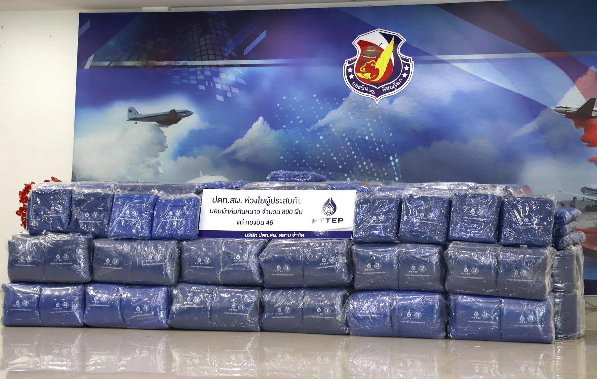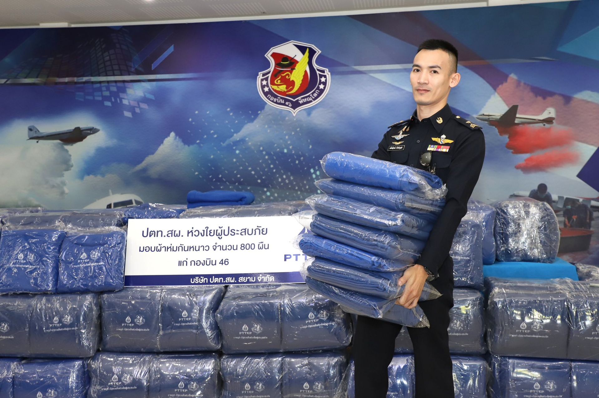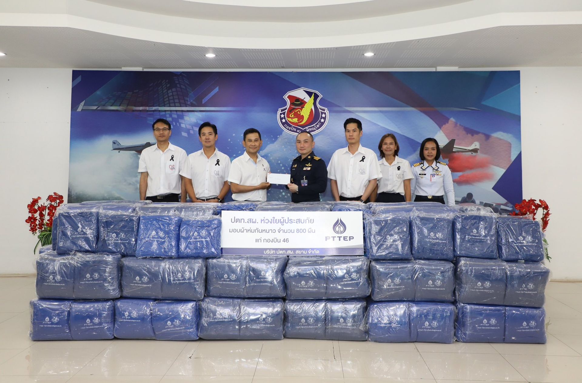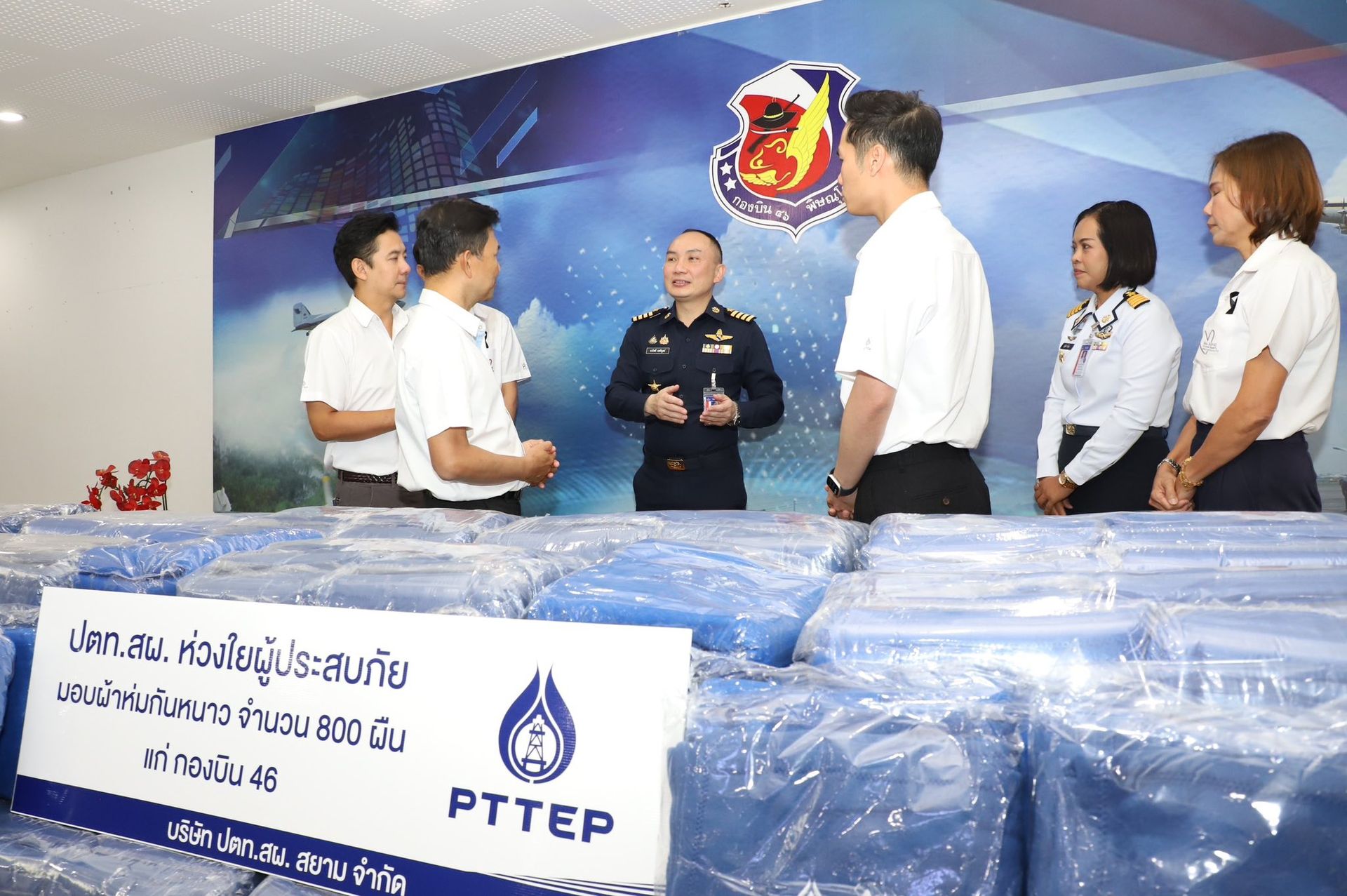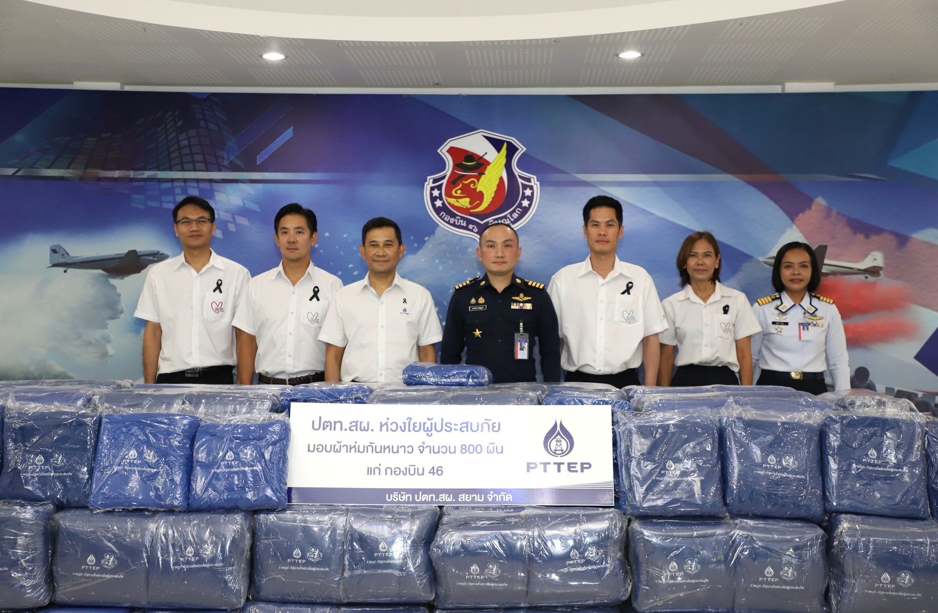 นาวาอากาศเอก นรกิตติ์ ผลพิบูลย์ รองผู้บังคับการกองบิน 46 รับมอบผ้าห่มกันหนาวจาก บริษัท ปตท.สำรวจและผลิตปิโตรเลียม จำกัด (มหาชน) โครงการเอส 1