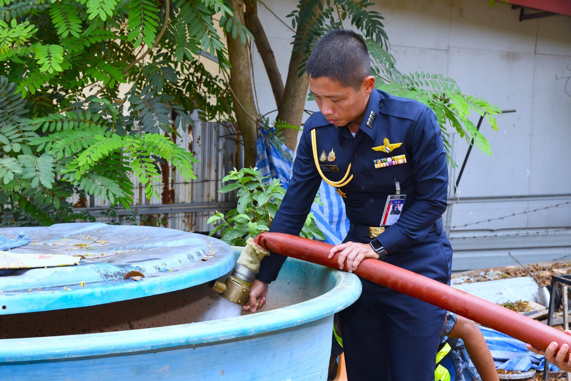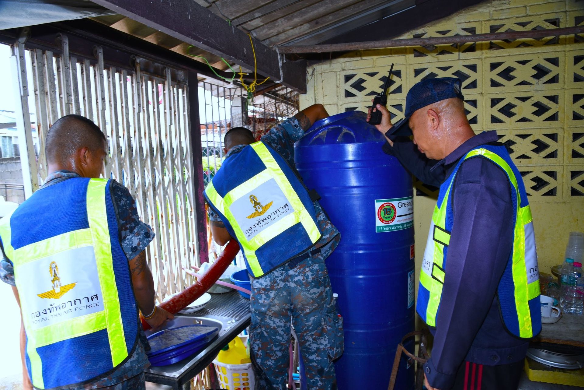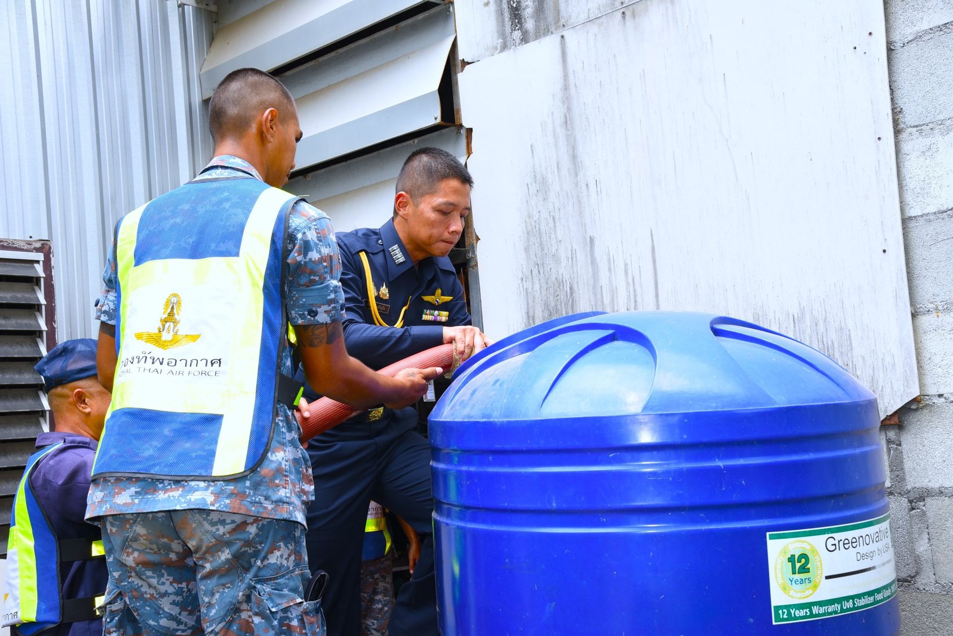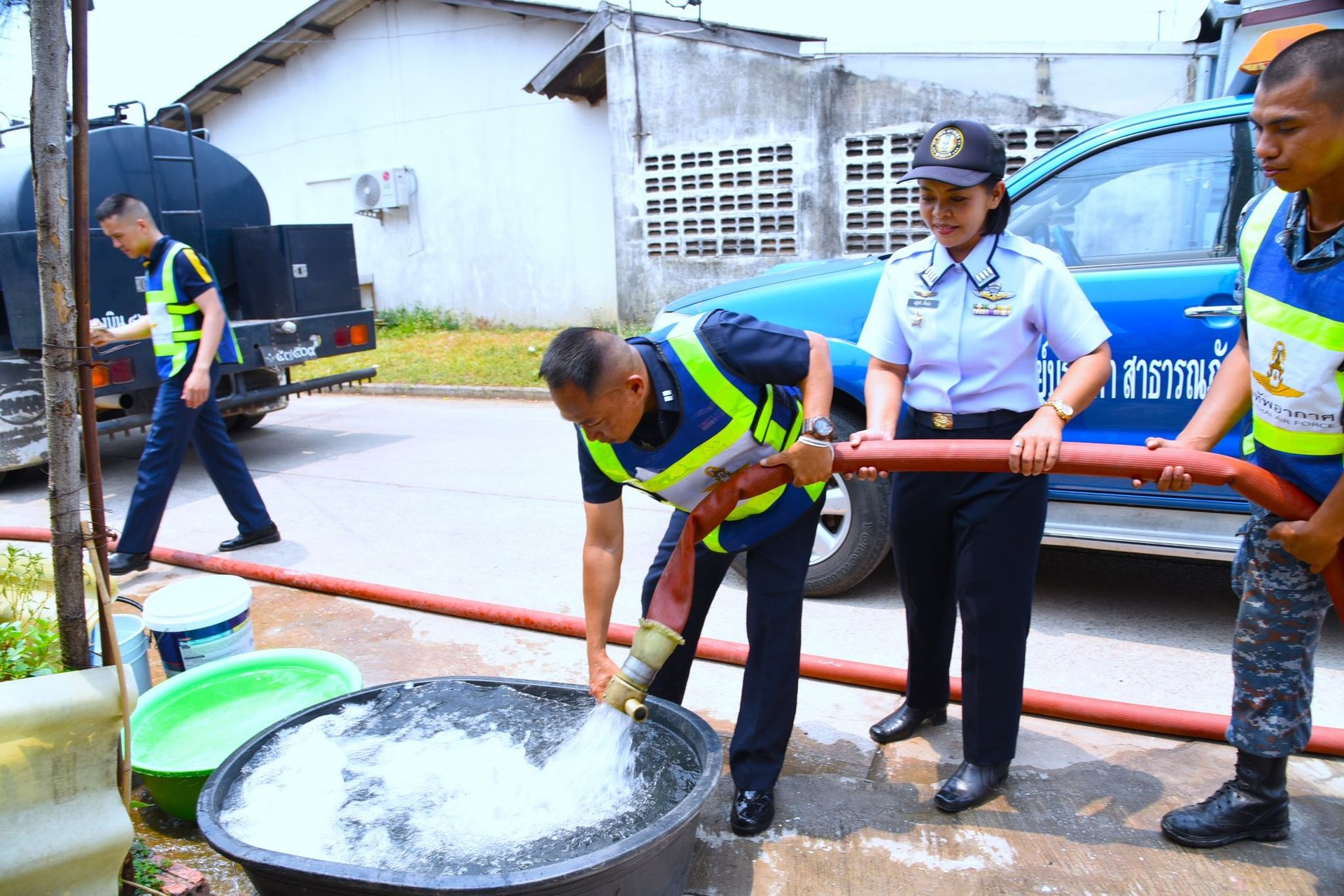 นาวาอากาศเอก ธีรพงษ์ เจริญยิ่ง เสนาธิการกองบิน 46 ในฐานะรองผู้อำนวยการศูนย์บรรเทาสาธารณภัย กองบิน 46 พร้อมด้วยกำลังพลและเจ้าหน้าที่ศูนย์บรรเทาสาธารณภัย กองบิน 46 นำรถบรรทุกน้ำสะอาด จำนวน 6,000 ลิตร ลงพื้นที่แจกจ่ายน้ำให้แก่พี่น้องประชาชน เพื่อใช้ในการอุปโภคบริโภค และบรรเทาความเดือดร้อนในเบื้องต้น